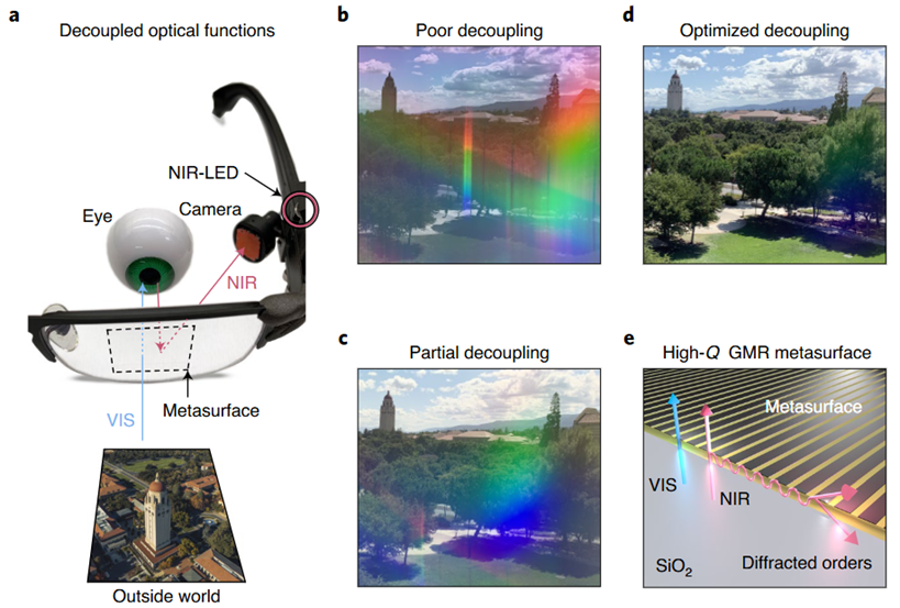 图a:在两层中均采用纳米柱单元胞,实现对两个不同波长的相位独立控制;双层结构可在两个不同波长下编码独立的纯相位全息图。图b:在两层中均采用偏振敏感谐振器,实现对两个不同波长的偏振独立控制,采用两种不同的谐振器结构,可进一步拓展设计空间。图c :将用于相位控制的纳米柱结构与用于振幅控制的强谐振纳米盘结构相结合,实现相位与振幅的独立控制。通过双层非晶硅纳米柱结构实现在两个不同红外波段下1180nm和1680nm的两个相互独立的全息成像。利用垂直堆叠结构替代空间交错,避免了超原子间的横向耦合,提升了成像质量和效率,可实现复振幅调制。